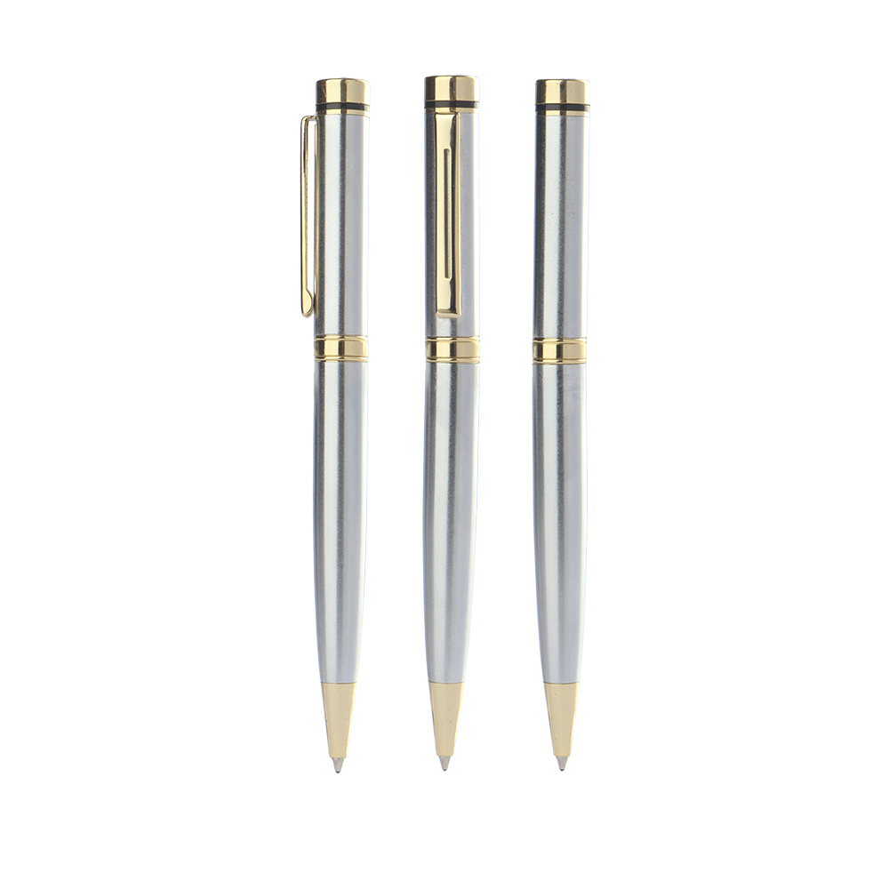 Descrição: Caneta metal CM 0300 prata com detalhes dourado. Clip metálico, parte superior, anel central e ponteira em dourado. Aciona por giro.